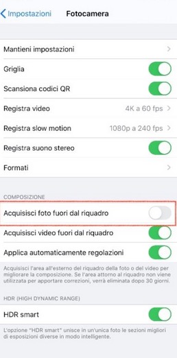 - Assicurati che la voce Acquisisci foto fuori dal riquadro sia disabilitata (questa opzione, infatti, va in conflitto con Deep Fusion se abilitata
