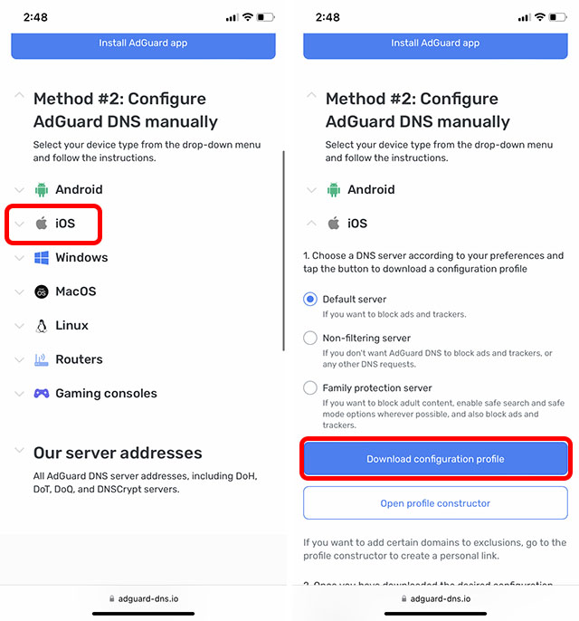 - Clicca su iOS per espandere la guida. Seleziona "Default server" e clicca su "Download Profile"