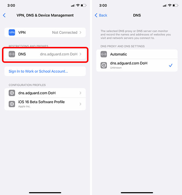 - Ad installazione complettata, Adguard DNS sarà stato installato sul tuo iPhone. Controlliamo però che sia attivo andando in Impostazioni > Generali > VPN, DNS..