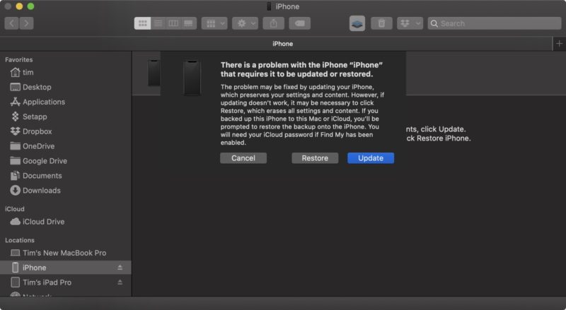 - iTunes o Finder di chiederanno di ripristinare e aggiornare il tuo iPhone o iPad: acconsenti e lascia fare al computer tutte le operazioni necessarie