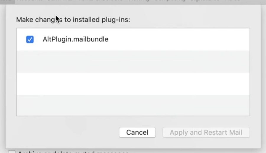 Ad installazione completata, riavvia l'app Mail, poi vai nelle Impostazioni dell'app Mail del Mac e attiva AltPlugin.