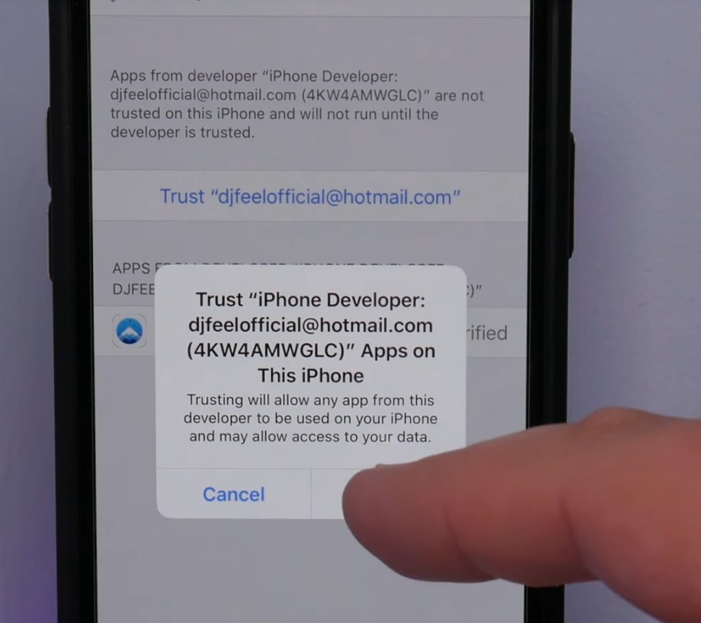 Qui vedrai la tua email legata all'account Apple (a dimostrazione del fatto che sei riconosciuto come uno sviluppatore): cliccaci sopra e approva tutte le richieste che compaiono, in modo da confermare che sei uno sviluppatore e che quindi tutte le app che andrai ad installare sono affidabili e certificate da te.