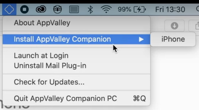Sempre in alto a destra, vicino all'orario, clicca di nuovo sull'icona di AppValley Companion, quindi vai su Install AppValley Companion e quindi seleziona il tuo dispositivo (iPhone, iPad..).