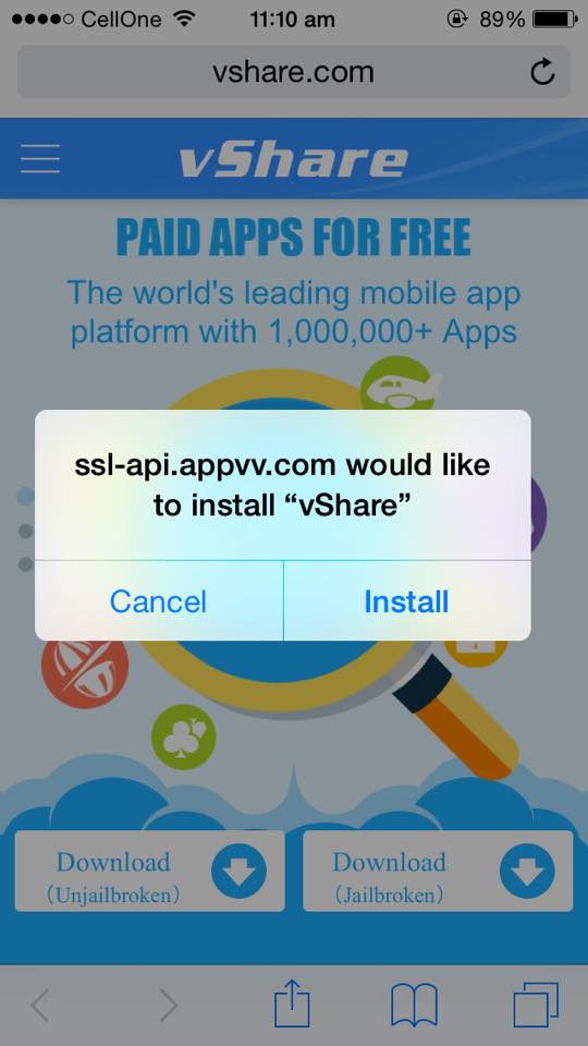 Step 3. Comparirà un messaggio di avvertimento relativo a SSL “ssl-api-appvv.com che vuole installare vShare” sul tuo smartphone. Clicca su Install