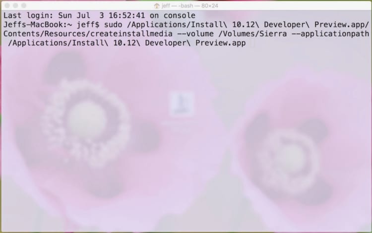 Aprite il Finder → Applicazioni e trascinate il file Installare 10.12 Developer Preview nella finestra del Terminale. Il risultato dovrebbe essere simile a questo: