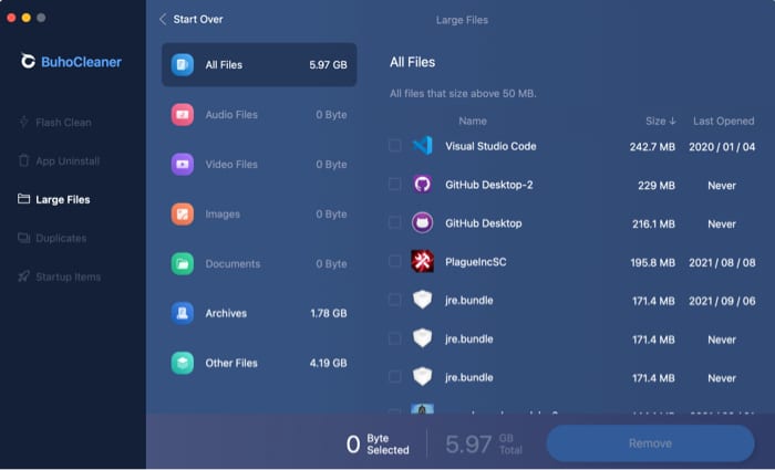 Questa è la funzionalità più utile e semplice da usare. Basta infatti avviare BuhoCleaner, premere sul pulsante Scan, lasciarlo lavorare e, a lavoro finito, cliccare su Remove.