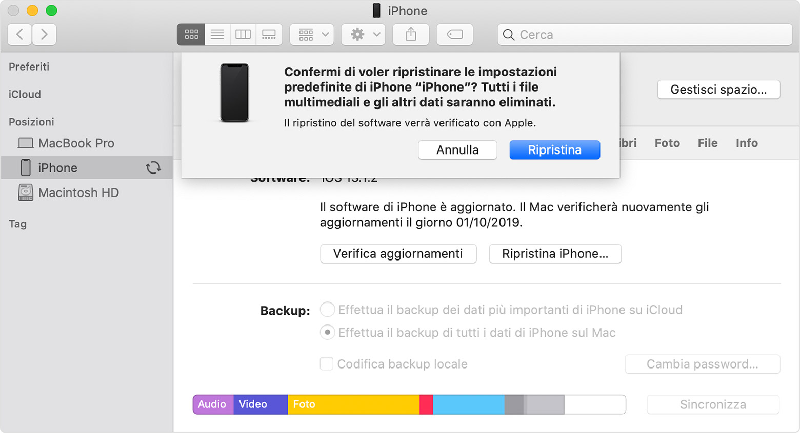 - Fai nuovamente clic su Ripristina per confermare. Il computer inizializza il dispositivo e installa la versione più recente di iOS, iPadOS o iPod