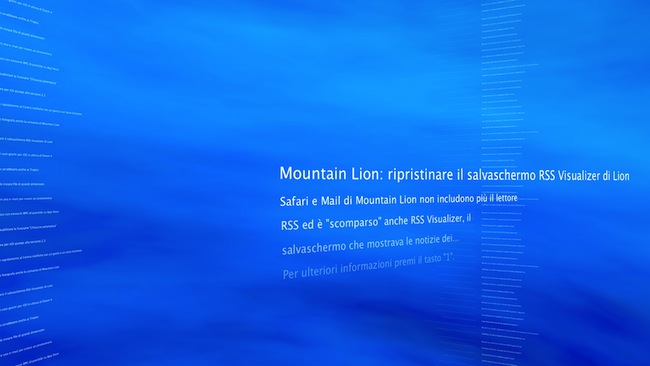 Comunque si può ripristinare tale funzionalità poichè RSS Visualizer funziona perfettamente con Mountain Lion, è sufficiente recuperarlo dal backup di Time Machine, il percorso da seguire è /Sistema/Libreria/Screen Savers, all’interno di quest’ultima cartella cercate e ripristinate il file RSS Visualizer.qtz (è sufficiente scegliere una data qualsiasi precedente all’installazione di Mountain Lion).