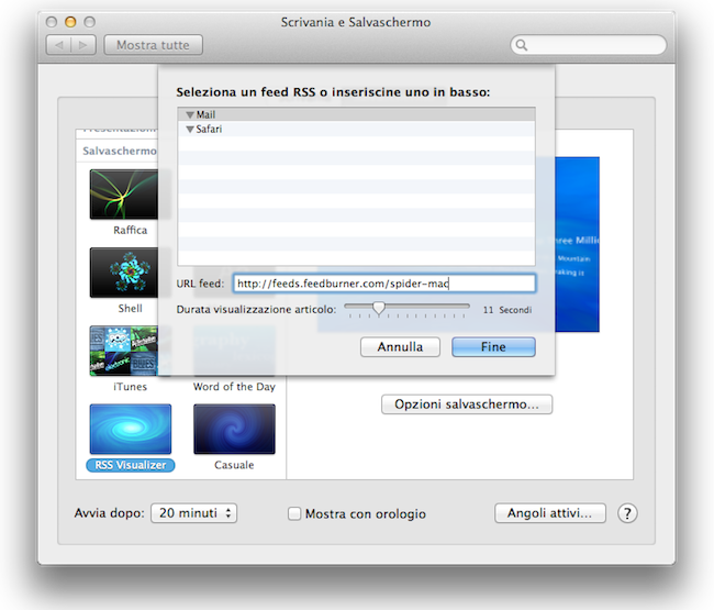 Recuperato il salvaschermo, copiatelo in Home/Libreria/Screen Saver e lanciate Preferenze di Sistema/Scrivania e Salvaschermo/Salvaschermo, evidenziate con un click RSS Visualizer nella colonna di sinistra, cliccate il pulsante “Opzioni salvaschermo”, e nel campo “URL feed” digitate quello del vostro sito preferito.