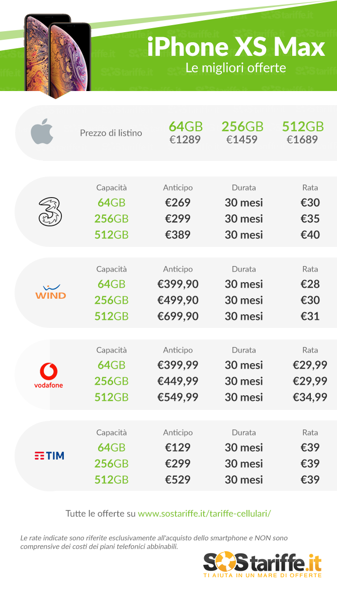 Analizza tutte le proposte degli operatori telefonici italiani e scegli con chi comprare iPhone XS e iPhone XS Max per spendere meno. Ricorda che in tutti i casi dovrai impegnarti a pagare le rate dell'abbonamento per 30 mesi, che non sono pochi.