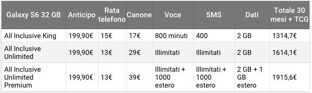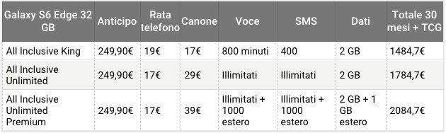 Il pacchetto ricaricabile prende il nome di Smartphone Box e, oltre alla quota anticipata, prevede un canone mensile di 16 euro per S6 e 20 Euro per S6 Edge, con incluso 1GB di traffico internet. Ovviamente è possibile personalizzare ulteriormente le opzioni per avere un pacchetto adatto alle singole esigenze. Usufruendo dell'opzione Smartphone Box si avrà un costo totale, quindi spalmato nei 30 mesi, di 679,90 Euro per S6 e di 849,90 Euro per S6 Edge, quindi sensibilmente inferiore di quello di mercato.