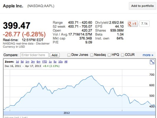Nella giornata di ieri, infatti, il prezzo relativo alle azioni Apple ha toccato nuovi minimi, scendendo sotto la soglia dei 400 dollari per azione. Stando agli ultimi dati diffusi dagli esperti di borsa, sembra proprio che il momento di crisi della società non conosca ancora la parola fine, facendo registrare ben 52 settimane in continua perdita, cioè un anno intero senza incrementi importanti sul valore della singola azione. Un trend di crescita decisamente negativo, che, con Steve Jobs al comando dell'azienda, non era nemmeno lontanamente ipotizzabile.