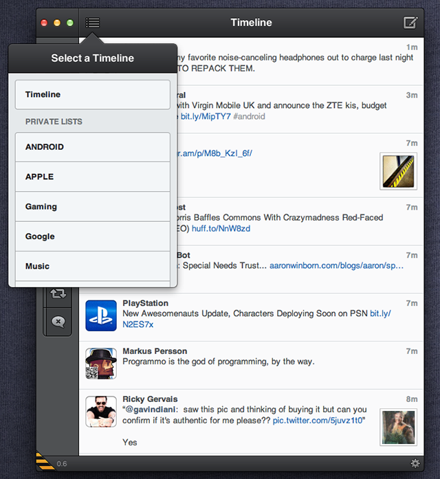 Inoltre si potrà passare facilmente da un account all'altro cliccando sull’immagine profilo nella barra laterale sinistra e saranno anche supportati gestures a una/due dita, che consentiranno di passare rapidamente alla conversazione o visualizzare dettagli per ogni tweet.