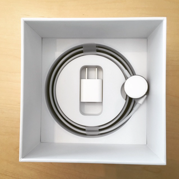 Questo è invece il contenuto di tutte le confezioni dell'Apple Watch in cui, sotto lo smartwatch troviamo il cavo di ricarica e l'alimentatore, universale per tutte le edizioni, Sport ed Edition. Cosa ve ne pare?