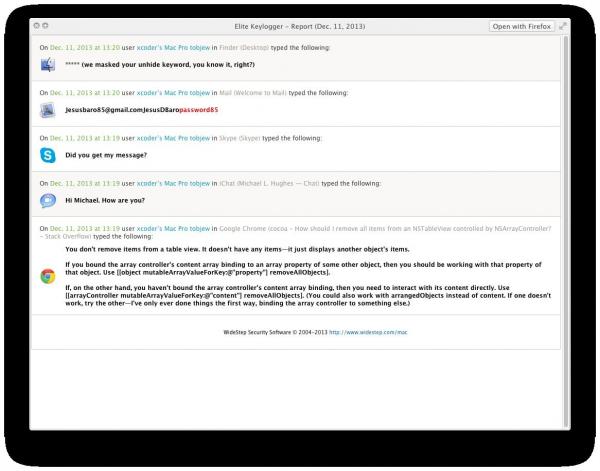 Nello stesso modo, il programma Elite Keylogger Pro può essere usato dal datore di lavoro per controllare se i dipendenti lavorano effettivamente o se passano il proprio tempo su Facebook. Elite Keylogger Pro è perfetto anche per scoprire, rubare e trovare la password di Facebook di chiunque vogliate: basta che la persona che volete spiare utilizzi il vostro Mac con Elite Keylogger Pro installato.