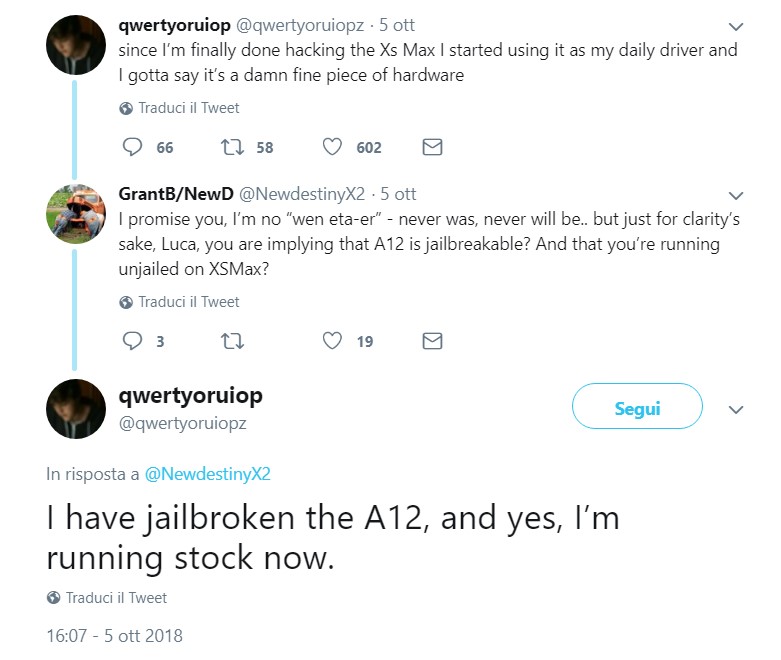 Al momento non è nota la procedura per cui si è ottenuto il jailbreak su iPhone XS Max ma non è escluso che a breve possano essere distribuiti tool che siano in grado di automatizzare il tutto e portare il jailbreak al pubblico con una procedura guidata e facile da eseguire..