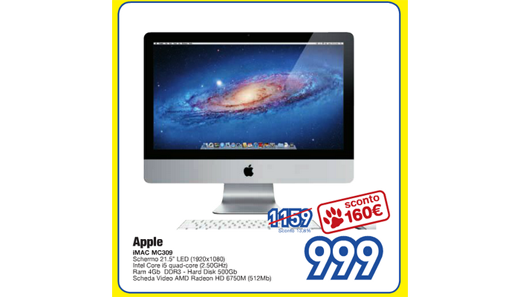 Grande offerta da Euronics infatti l'iMac da 21,5 pollici è in offerta a soli 999 euro. La promozione è valida dal 30 Agosto al 16 Settembre.