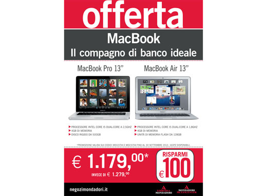 Nei negozi Mondadori ci sono grandi offerte per chi vuole acquistare un Macbook pro o Air. I Macbook Pro e Air da 13 pollici sono scontati di 100 euro quindi ad esempio il MacBook pro lo pagheremo 1.179 euro anzichè 1.279.