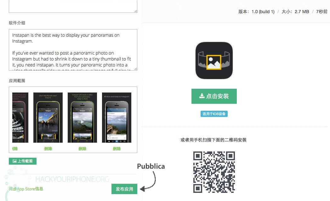 A fine caricamento, comunque, potrete vedere tutte le informazioni dell'applicazione caricata. A fine pagina troverete il pulsante "Pubblica": premendolo l'applicazione verrà pubblicata sul sito e potrete scaricarla con il vostro iPhone, iPod e iPad.
