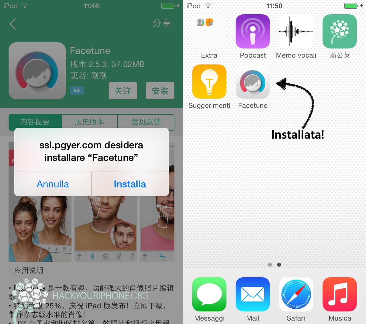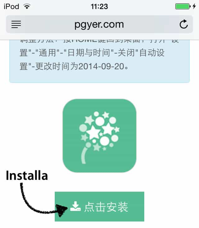 Ora dovrete installare l'applicazione Pgyer, che vi permetterà di scaricare e installare le applicazioni, i programmi e i giochi in formato IPA manualmente e senza jailbreak. Per fare questo, aprite Safari e andate su http://www.pgyer.com/pgyios, quindi premete il grosso pulsante verde per aprire l'avviso che vi chiederà di installare l'app; successivamente premete su Installa e Pgyer si installerà.
