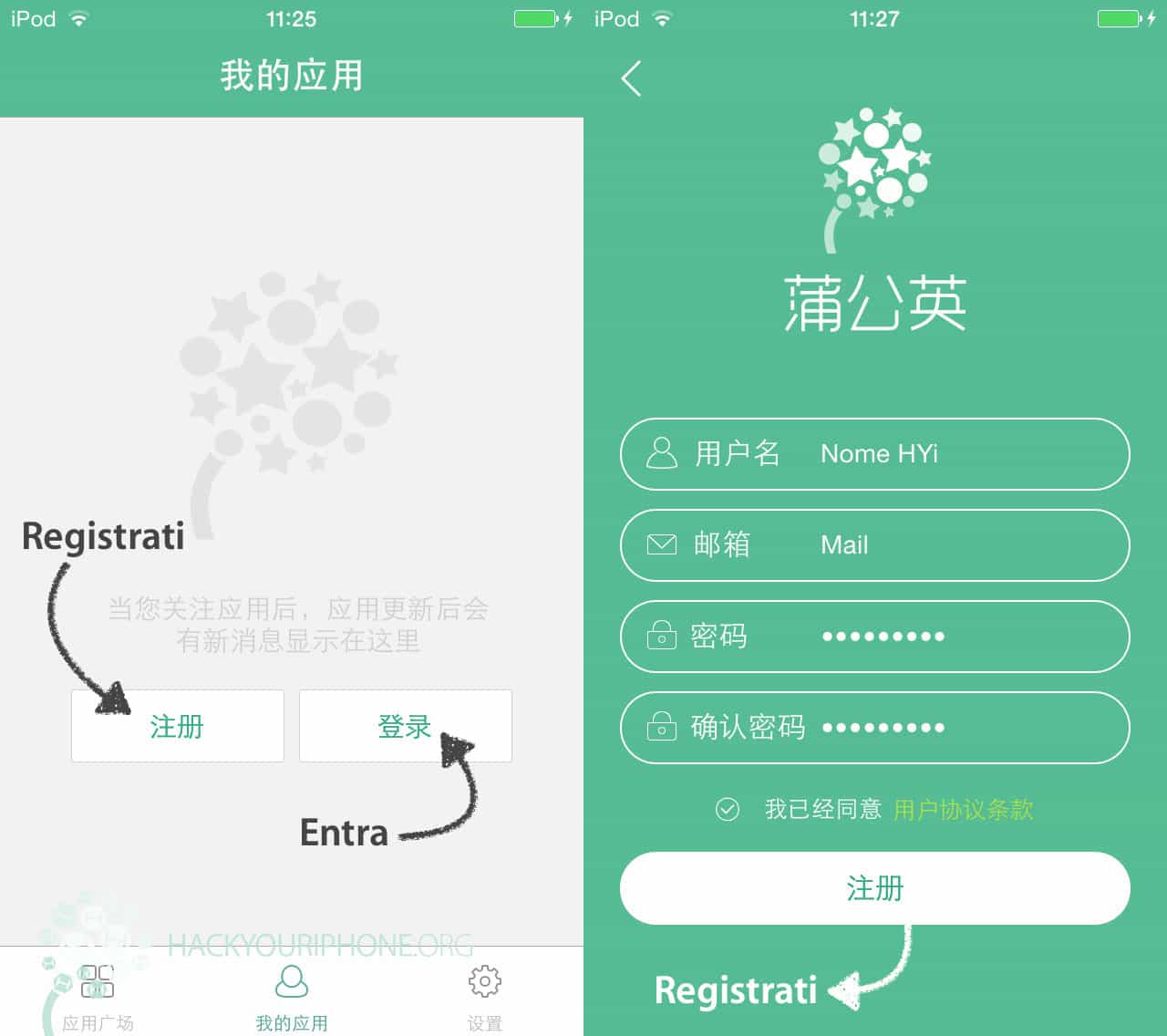 Una volta avviata l'applicazione, procedete alla creazione di un account andando nella schermata centrale (quella con l'omino). Premete sul primo bottone "Registrati", inserite i vostri dati e premete su "Registrati". Riceverete via mail un link per attivare l'account: molto probabilmente troverete la mail nella cartella Spam (la troverete facilmente perché ha un titolo cinese). Dopo l'attivazione effettuate il login nell'applicazione su iPhone, iPod, iPad.