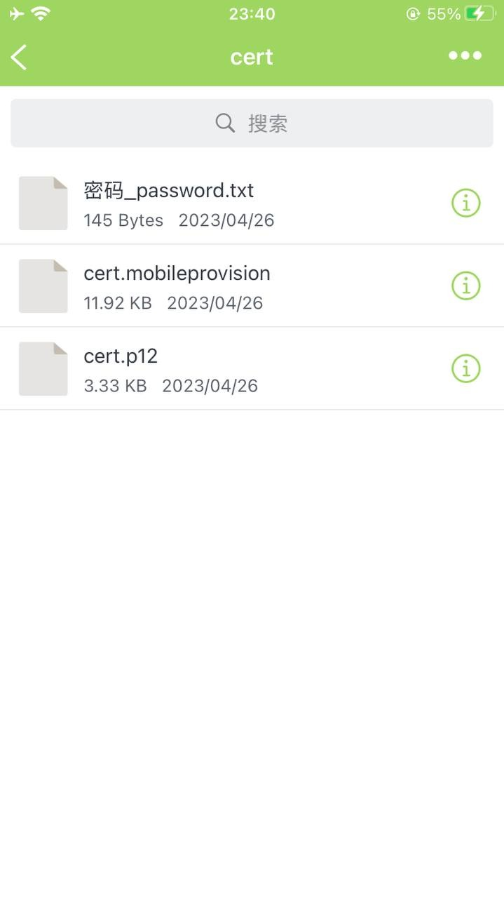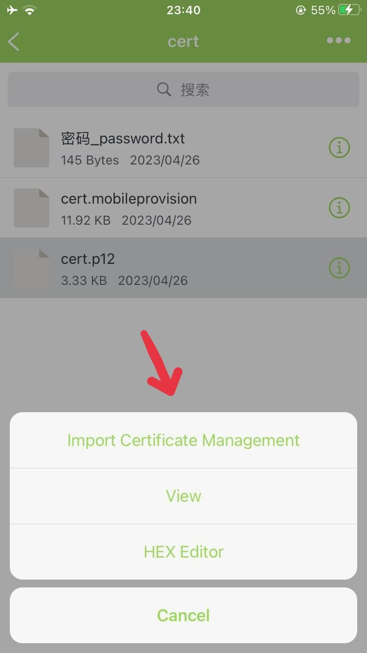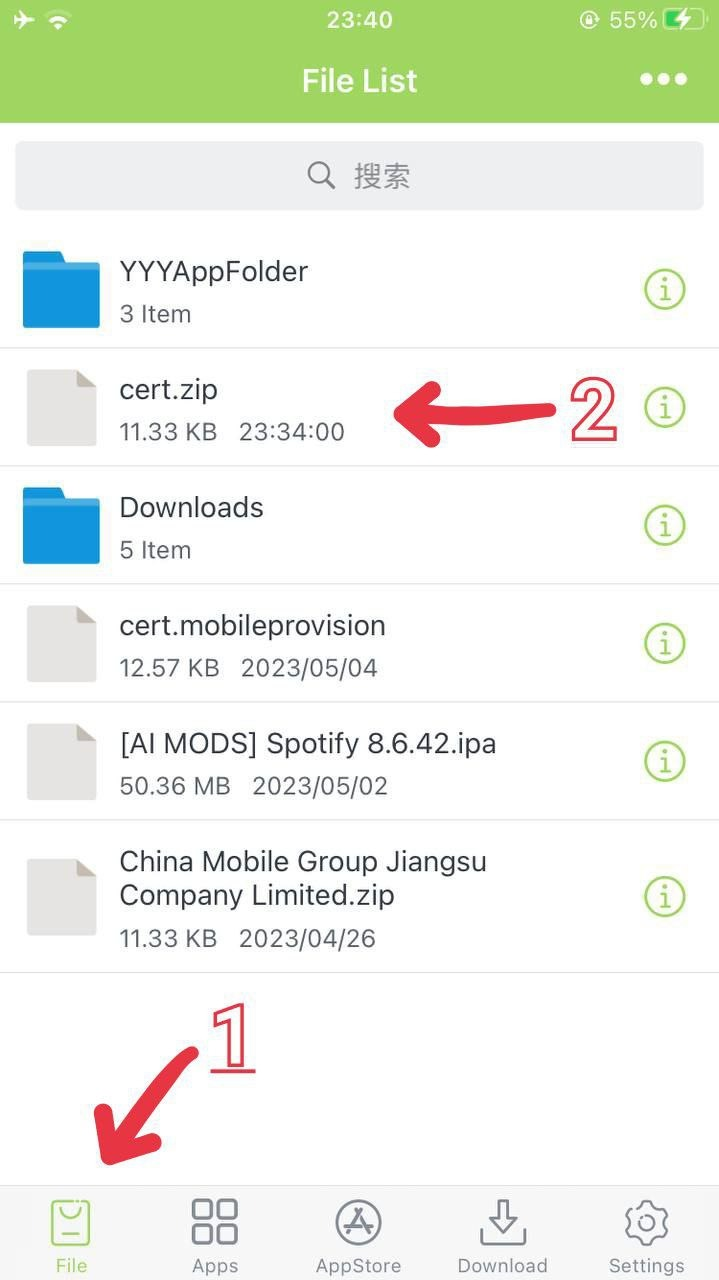 - Vai nella prima icona in basso File: fai un tap su cert.zip e premi unzip