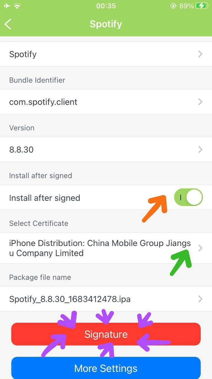 - Seleziona Install After Signed (freccia arancio)