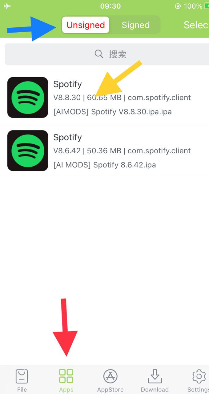 - Al termine del caricamento vai nella scheda Apps (freccia rossa), dove vedrai due colonne: a sinistra Unsigned e a destra Signed