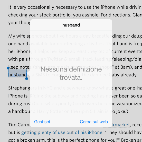 iOS 7 aggiunge il dizionario delle definizioni per l’italiano (oltre che per il coreano e l’olandese) che permette di visualizzare la definizione di una parola in (quasi) qualsiasi app. Per ottenere questa funzionalità basta toccare per alcuni secondi una parola, scegliere la voce Definisci poi, in fondo allo schermo, scegliere Gestisci e scaricare il dizionario Italiano dall’icona a forma di nuvoletta. Non è completo e non riconosce le forme flesse delle parole (riconosce messaggio ma non riconosce messaggi), ma è certamente meglio di niente.