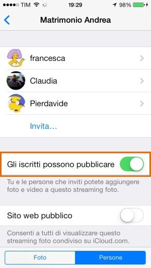 Per chi ha dispositivi iOS, il modo migliore per condividere immagini (e con iOS 7 anche video) è utilizzare la condivisione con iCloud: basta selezionare le foto, selezionare la condivisione iCloud, invitare altri utenti e questi si ritroveranno tutte le foto nel loro archivio. In precedenza però le persone con cui si condivideva un album potevano solamente scaricare foto , ma non caricarle a loro volta. In iOS 7 è finalmente possibile permettere agli altri di aggiungere foto al proprio album: l’opzione si trova nelle proprietà dell’album condiviso.