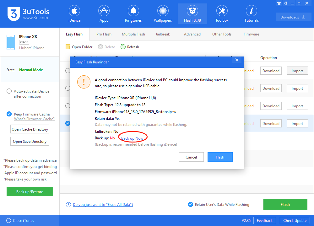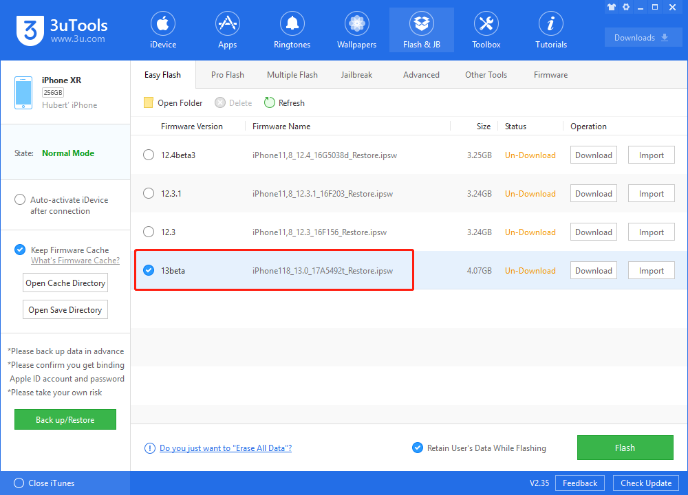 - vai alla voce Flash & JB →Easy Flash, scegli il firmware iOS 13beta. Se vuoi aggiornare SENZA FORMATTARE, clicca su "Retain User's Data While Flashing"; in caso contrario, se vuoi formattare (e perdere i dati), procedi cliccando su "Flash" senza mettere la spunta