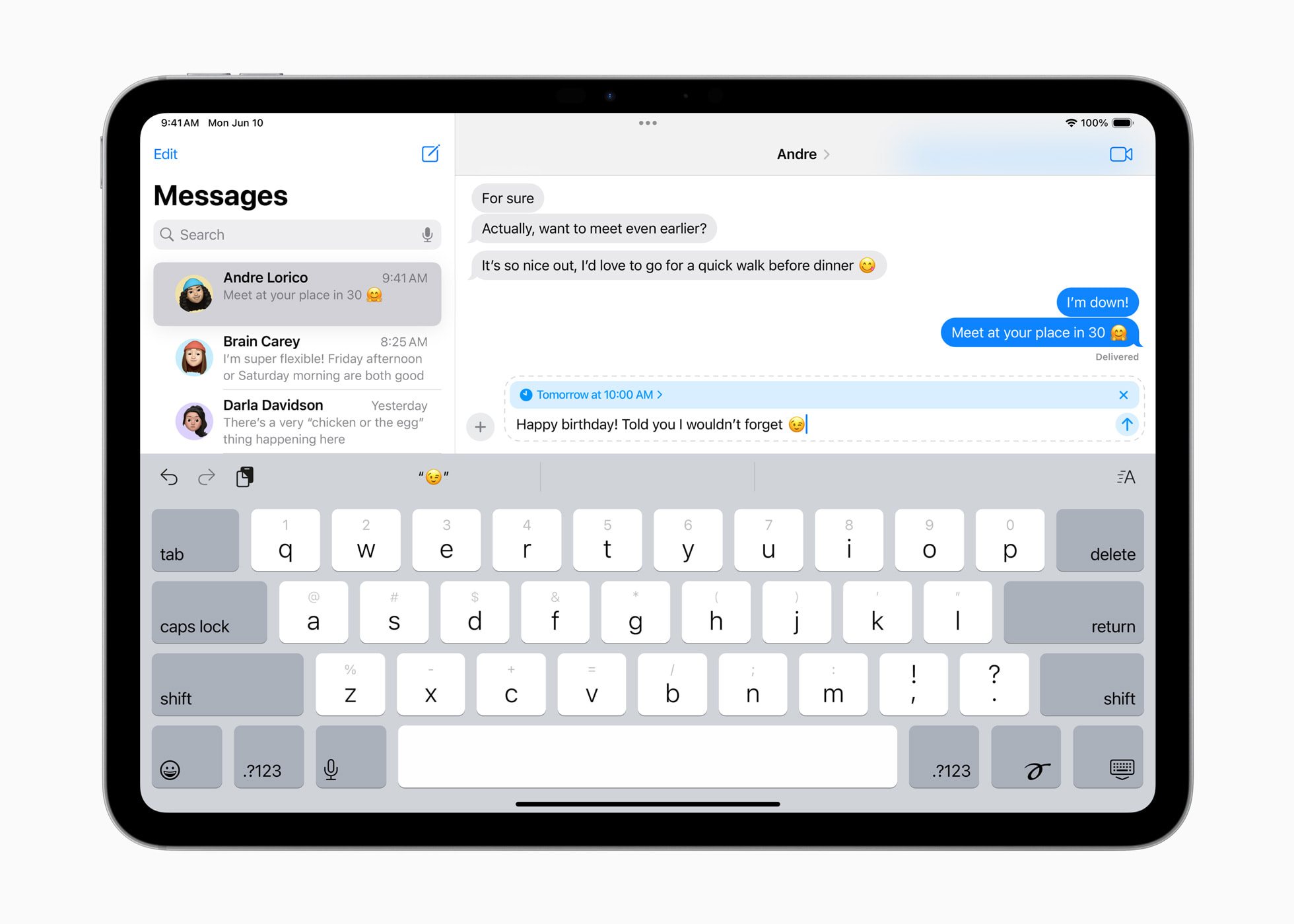 Messaggi in iPadOS 18 introduce la possibilità di programmare i messaggi per inviarli in un secondo momento, così si può avere un maggior controllo sulle tempistiche e su come restare in contatto con le persone più importanti.