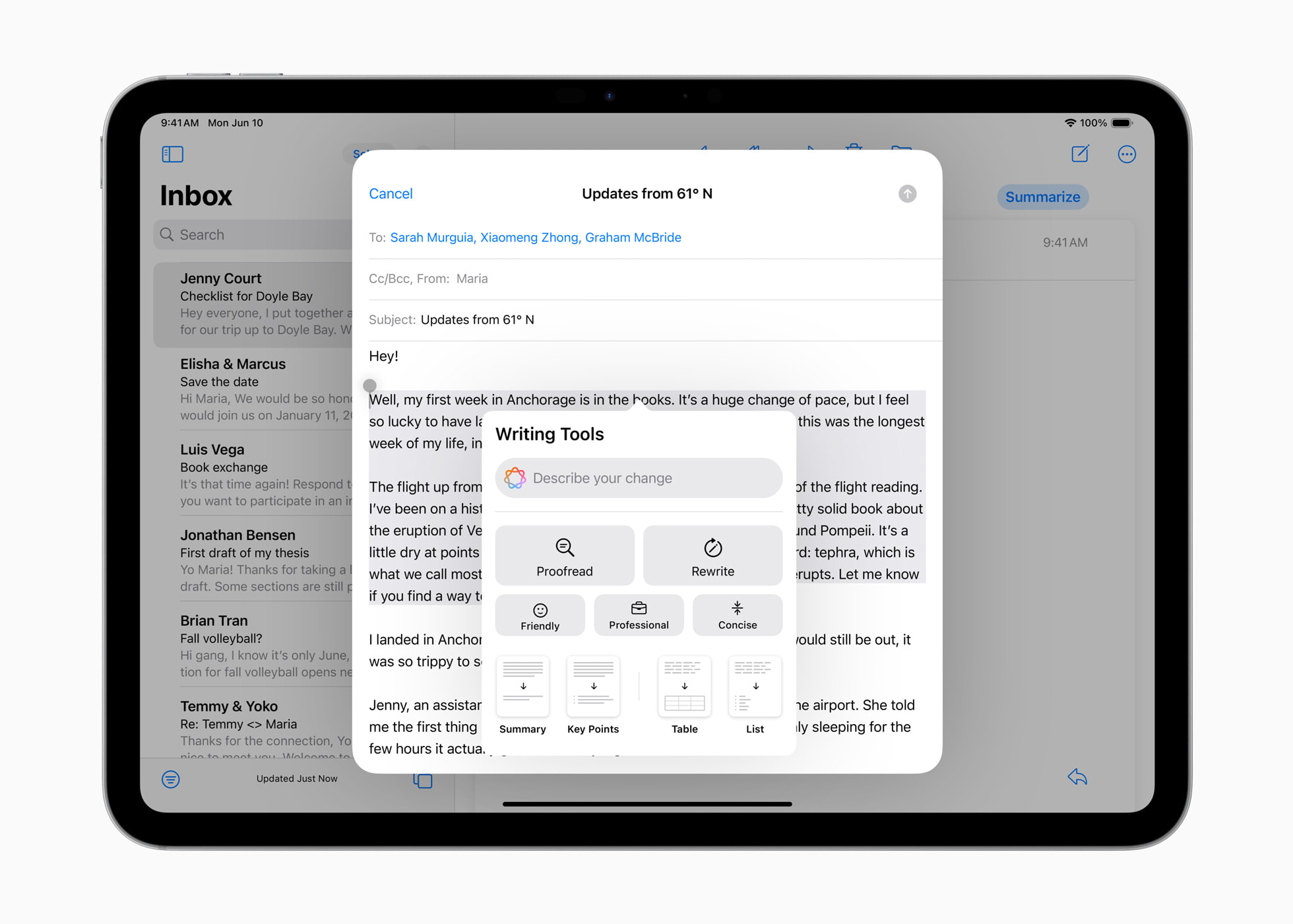 Con i nuovissimi Writing Tools disponibili in iPadOS 18 a livello di sistema, l’utente può rielaborare, revisionare e sintetizzare il testo in pressoché qualsiasi app, tra cui Mail, Note, Pages e altre app di terze parti.