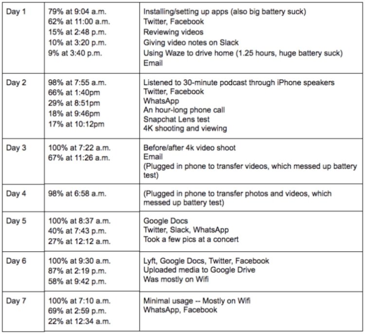 Ecco la tabella completa che mostra i risultati dei test effettuati sulla batteria di iPhone X: