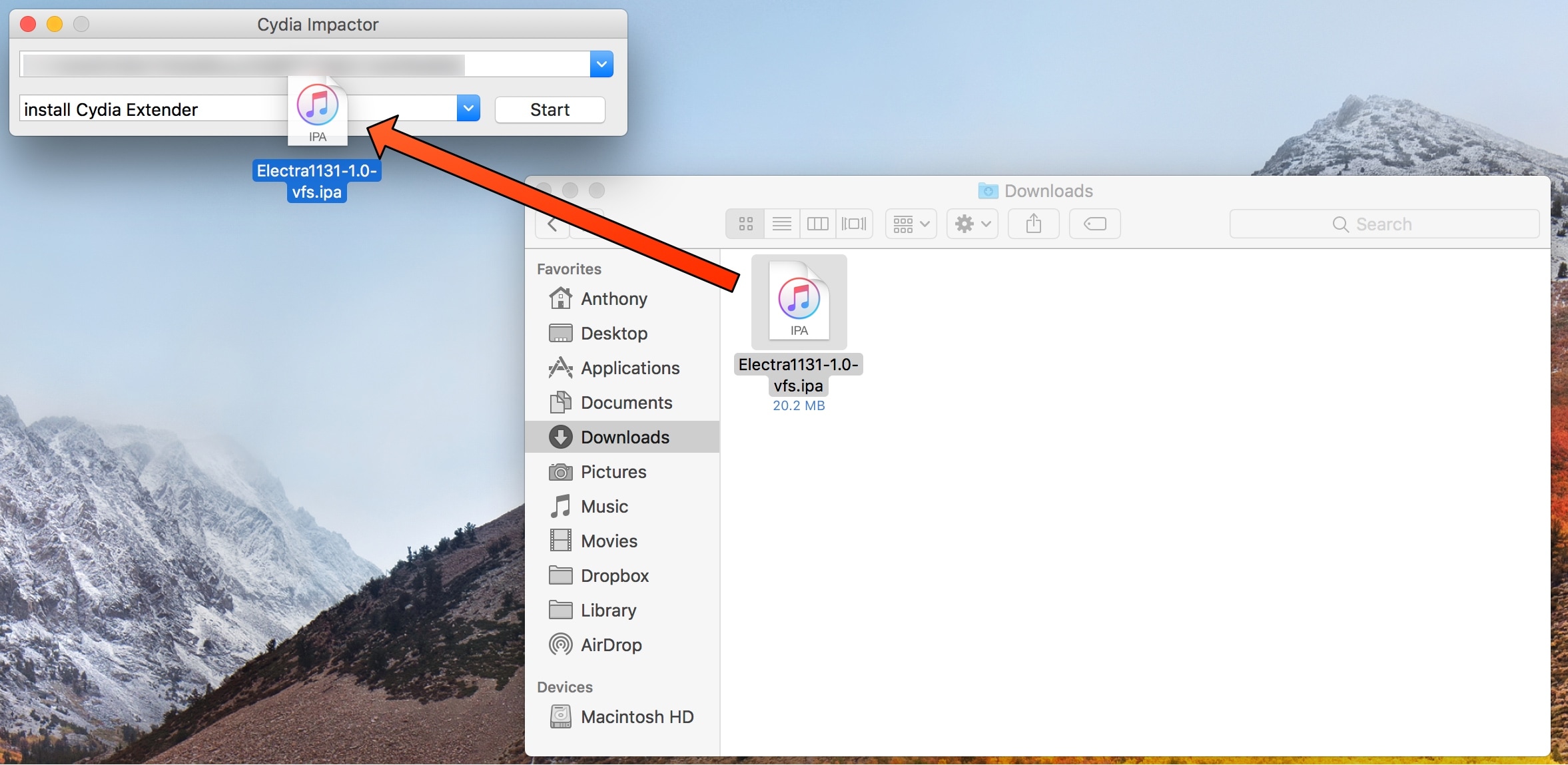 4) Clicca e trascina il file Electra1131.ipa su Cydia Impactor