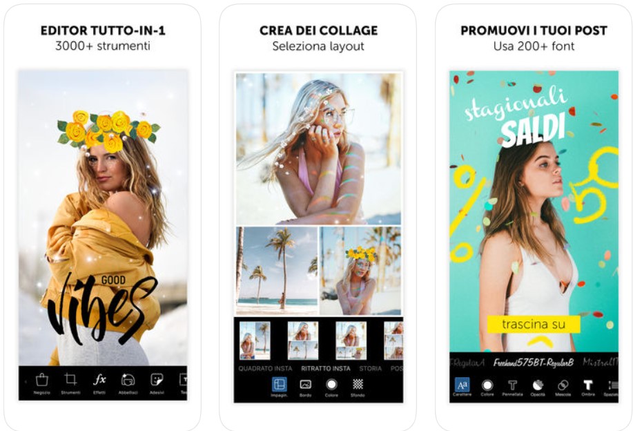PicsArt è uno degli editor gratuiti più completi in assoluto dove avrete una miriade di funzioni per modificare le foto, creare collage, aggiungere migliaia di effetti speciali, adesivi, font, cornici e altro ancora. Buona parte degli effetti più belli sono a pagamento ma quelle base come anche la possibilità di inserire testo ed applicare filtri fotografici, cornici ed altro sono gratis. Non deve mancare sul vostro smartphone.