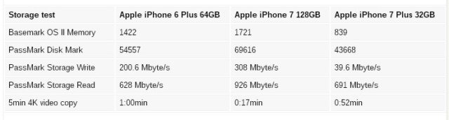Durante i test, effettuati attraverso l'utilizzo dell'app Basemark OS II, la versione da 32GB dell'iPhone 7 ha mostrato una velocità di scrittura pari a 39,6 megabyte al secondo, mentre l'iPhone 7 da 128 GB scrive a 308 megabyte al secondo.