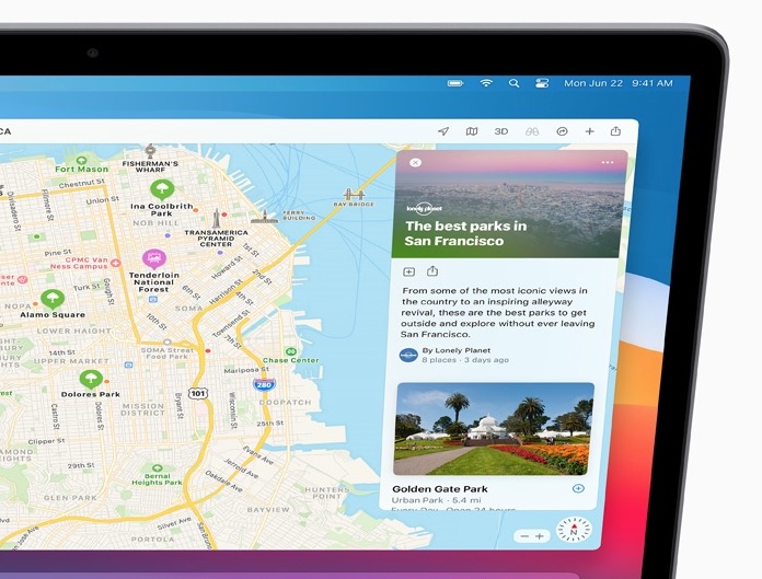 - il software Mappe, completamente ridisegnato per macOS Big Sur, ora permette di sfruttare la funzionalità Guide per ottenere informazioni da fonti verificate su cose da fare e luoghi da scoprire, oppure creare itinerari personalizzati di parchi, ristoranti e luoghi di svago preferiti, che possono poi essere condivisi facilmente con amici e familiari. La funzionalità Look Around permette di avere una vista a 360 gradi del posto, inoltre è possibile ottenere mappe dettagliate degli interni di aeroporti e centri commerciali. L’integrazione nell’ecosistema Apple permetterà di pianificare itinerari di viaggio in bici e con veicoli elettrici direttamente sul Mac, per poi trasferirli su iPhone per averli sempre a portata di mano