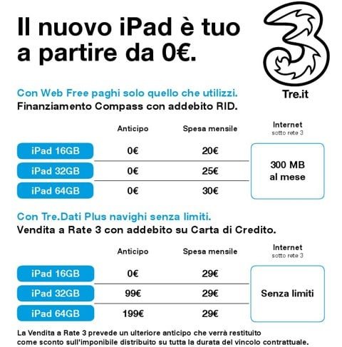 - iPad 16 GB: contributo iniziale 0 euro con 29 € al mese con 3 GB fino a 7,2 Mbps o 35 € al mese per 7 GB per una velocità di 43,2 Mbps