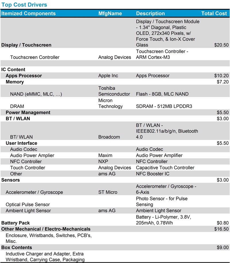 Eccovi la tabella con tutti i costi pezzo per pezzo del nuovo Apple Watch Sport Edition con cassa da 38mm: