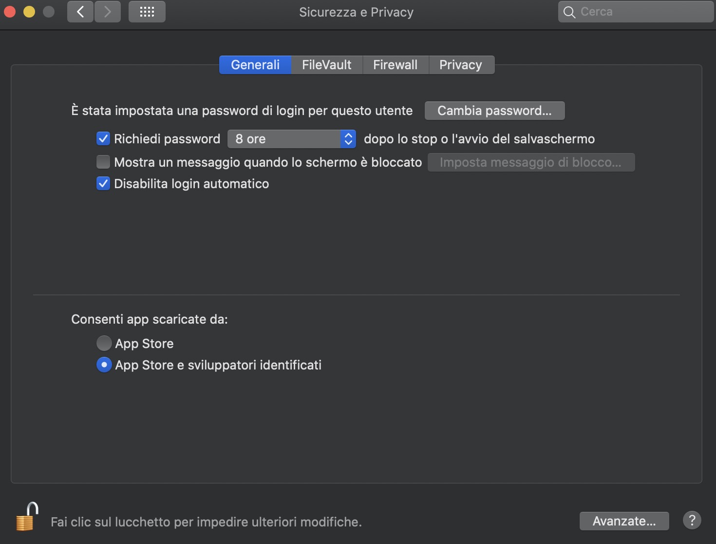 Vai in Preferenze di sistema > Sicurezza e Privacy > Generali e clicca sul lucchetto in basso a sinistra (dopo aver messo la password richiesta).