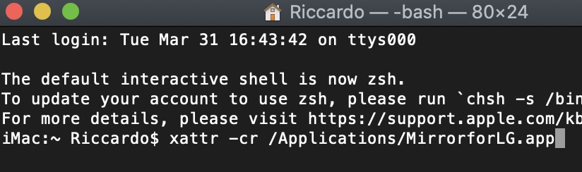 - a questo punto, modifica questa stringa xattr -cr /Applications/XXXXXX.app andando a sostituire nella parte "XXXXXX" il nome del programma che hai appena rinominato. Nel mio caso la stringa è diventata: xattr -cr /Applications/MirrorforLG.app