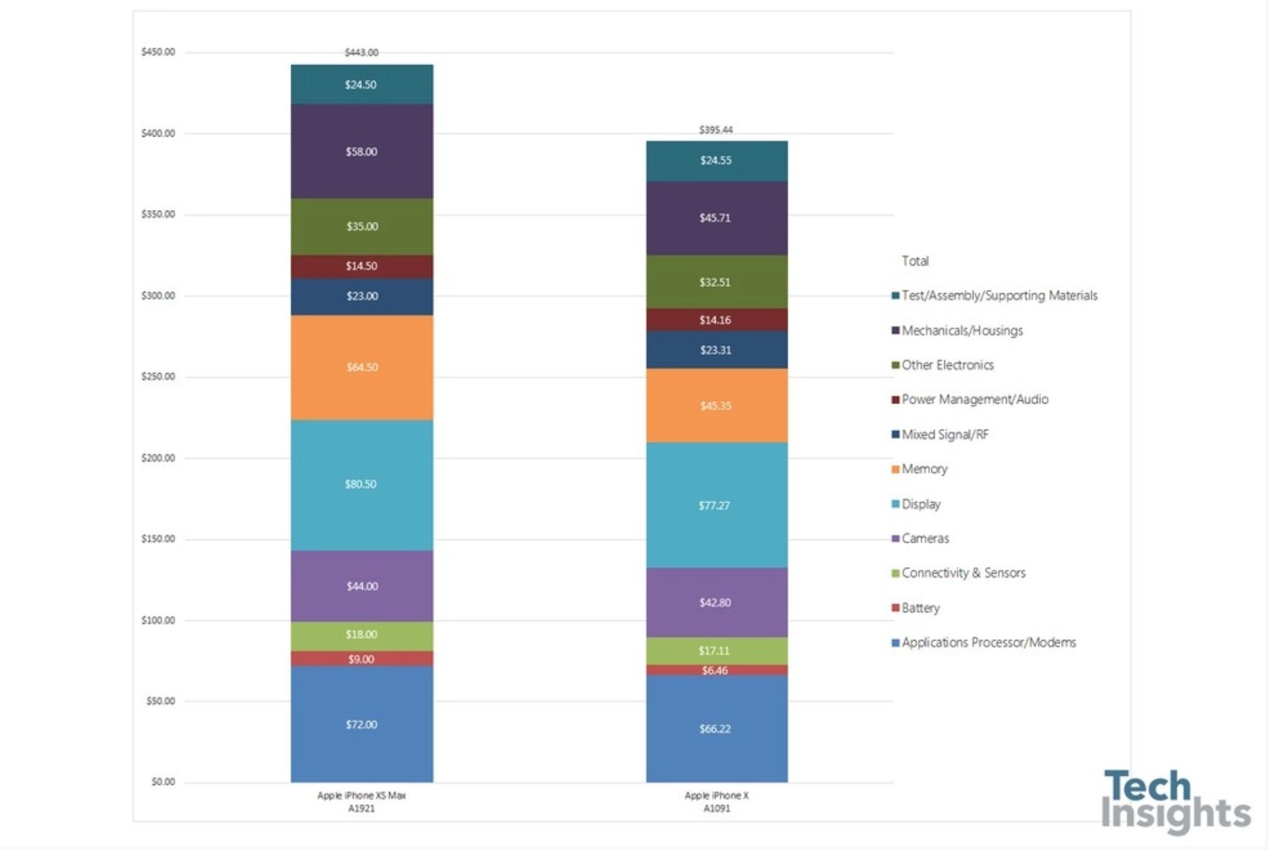 Il costo di iPhone XS Max è superiore di soli 50 dollari rispetto ad iPhone X. Secondo TechInsights produrre un iPhone XS Max costa 443 dollari