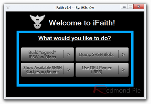 - Aprite iFaith e create un custom firmware firmato premendo su “Build *signed IPSW w/Blobs”