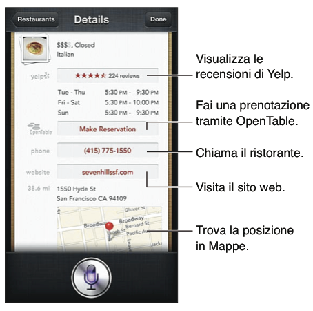 Visualizzare informazioni dettagliate su un ristorante: tocca un ristorante suggerito da Siri.