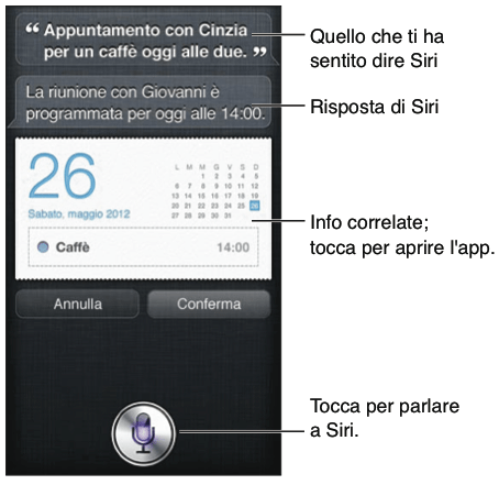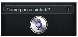 Siri è un assistente intelligente che ti aiuta a fare tutto quello che gli chiedi. Siri capisce la voce naturale, così non devi imparare determinati comandi o ricordare parole chiave. Puoi chiedere le cose in modi diversi. Per esempio, puoi dire “Metti la sveglia alle 6:30” o “Svegliami alle 6:30 di mattina”. In entrambi i modi, Siri lo capisce. Siri è disponibile su iPhone 4S o versioni successive!