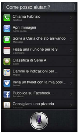 Siri ti permette di inviare un messaggio, fissare una riunione, effettuare una chiamata, ottenere indicazioni, impostare un promemoria, eseguire ricerche sul web e altro ancora, semplicemente parlando con naturalezza. Siri ti pone una domanda se occorrono chiarimenti o ulteriori informa- zioni. Inoltre, Siri utilizza le informazioni presenti nei contatti, nella libreria musicale, nei calendari, nei promemoria e così via, per capire di cosa stai parlando.