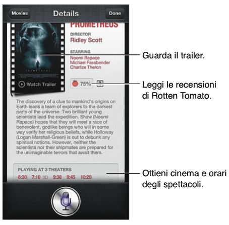 Chiedi a Siri i film in uscita nelle sale o in quale sala puoi vedere un determinato film. Scopri quando è uscito un film, chi l’ha diretto e quali premi ha vinto. Siri ti propone i cinema, gli orari degli spettacoli e le recensioni direttamente da Rotten Tomato.