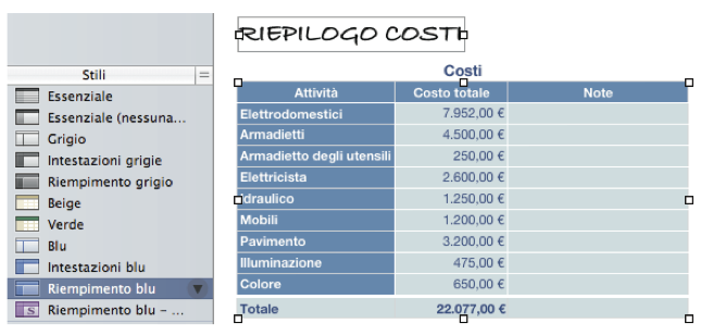 l pannello Stili consente di applicare rapidamente una formattazione predefinita alle tabelle di un foglio di calcolo. Gli stili tabella definiscono la formattazione di attributi come colore, dimensione del testo e bordo delle celle di una tabella.