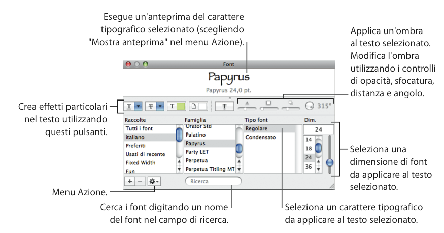 Utilizza la finestra Font per selezionare i font, le dimensioni font e altre funzioni di formattazione dei font, incluse le ombre e la cancellazione del testo. Inoltre, puoi utilizzare la finestra Font per organizzare i font preferiti e quelli che utilizzi più frequentemente e averli sempre a portata di mano.